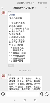 体育教育部直属党支部下属两个党小组根据实际情况开展了形式多样的学习活动,第一党小组开展“疫情防控空中小课堂”,学资料、做总结、重承诺、强交流,将疫情防控工作做细做实做深。顾月明老师感慨:特殊时刻,一切听从组织安排,多付出,少添乱;陈军老师鼓励大家保持乐观,相信在党和国家领导下,我们一定可以共度难关。第二党小组则以《守“沪”家园 期待花开 》为主题,通过超越距离的学习和沟通,为每一位党员教师打了一针“强心剂”,凝聚了力量,重拾了信心,抚平了焦虑。老师们备受鼓舞,杨德洪老师期待上海回归正常,大家校园再相见;万芹老师承诺做好一己事,一切听指挥。