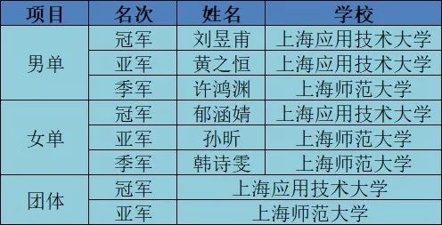 2018年5月6日,由上海应用技术大学体教部体育协会乒乓球协会主办的海湾三校乒乓球比赛在我校乒乓房拉开了序幕,比赛本着“友谊第一,比赛第二”的精神,在友好的气氛中进行。经过一整天的激烈角逐,最终,我校斩获团体冠军,刘昱甫、郁涵婧分获男单、女单冠军,黄之恒获男单亚军。