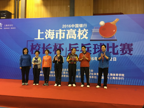 11月12日,由市教委主办的2016年中国银行上海市高校“校长杯”乒乓球比赛在上海体育学院举行。我校代表队由校党委副书记宋敏娟,副校长陈东辉、叶银忠、张锁怀组成,经过一天的激烈角逐,最终获得大赛第六名。宋敏娟以全胜战绩获得了“优秀运动员(全胜奖)”的殊荣。
