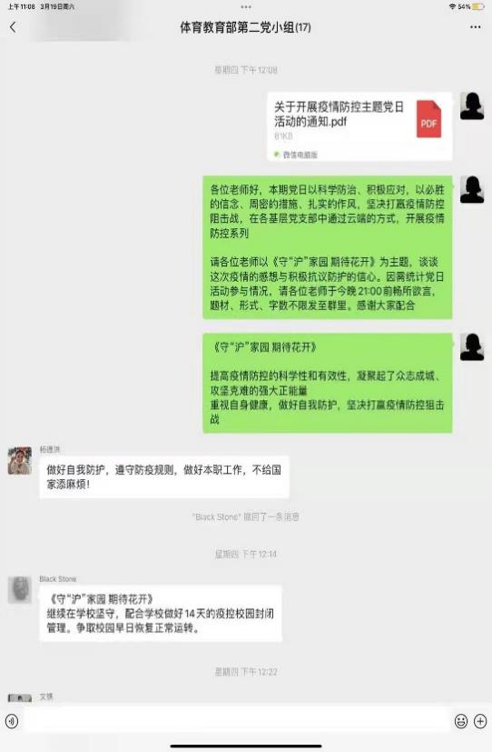 体育教育部直属党支部下属两个党小组根据实际情况开展了形式多样的学习活动,第一党小组开展“疫情防控空中小课堂”,学资料、做总结、重承诺、强交流,将疫情防控工作做细做实做深。顾月明老师感慨:特殊时刻,一切听从组织安排,多付出,少添乱;陈军老师鼓励大家保持乐观,相信在党和国家领导下,我们一定可以共度难关。第二党小组则以《守“沪家园 期待花开 》为主题,通过超越距离的学习和沟通,为每一位党员教师打了一针强心剂,凝聚了力量,重拾了信心,抚平了焦虑。老师们备受鼓舞,杨德洪老师期待上海回归正常,大家校园再相见;万老师承诺做好一己事,一切听指挥。