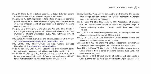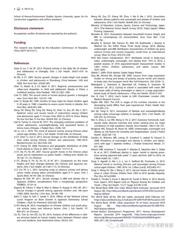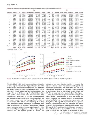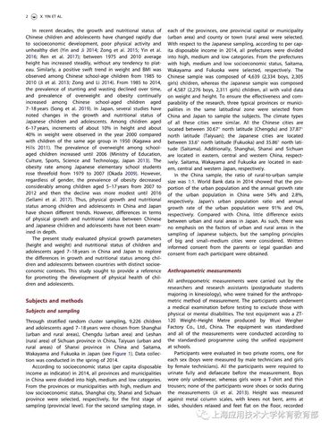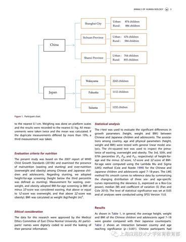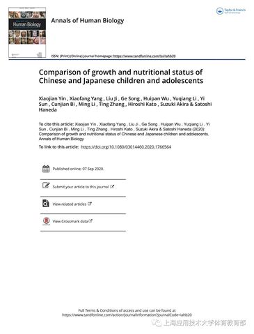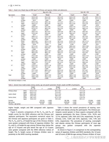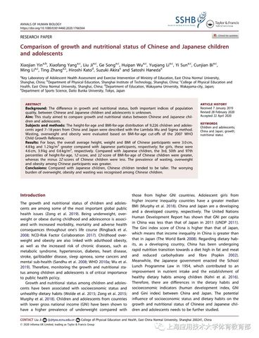 近期,我校体育教育部主任尹小俭教授以第一作者在国际SSCI&SCI双收录著名期刊《Annals of Human Biology》上,发表了题为“中日儿童青少年生长发育、营养状况的比较(Comparisonof growth and nutritional status of Chinese and Japanese children andadolescents)”的研究性论文,该研究结果表明,总体而言,中国7-18岁男生在身高、体重上分别较日本男生高3.0cm和4.8kg,女生分别高4.6cm和3.9kg;在营养状况上,中国儿童青少年消瘦、超重以及肥胖率均高于日本。该研究进一步揭示,与日本相比,中国儿童青少年虽然在身高上占据优势,但体重上却面临超重肥胖和消瘦率较高的双重压力,因此,我国应采取有效措施控制儿童青少年体重,从而降低消瘦、超重和肥胖的发生。