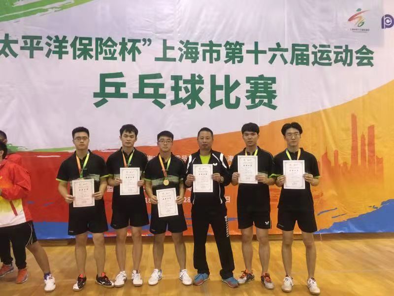 2018年10月28日,上海市第16届运动会乒乓球比赛在华东理工大学奉贤校区举行。我校由城建学院秦志意、黄之恒,经管学院严铠成、陈云扬,鲁班书院刘昱甫五位同学组成的乒乓男队在主教练郑听雷老师的带领下勇夺普通组男子甲组团体金牌。
