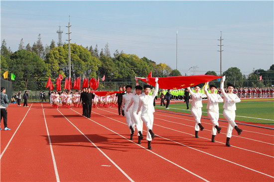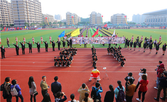 伴随着激昂的《运动员进行曲》,仪仗队高擎着国旗、校旗,迈着铿锵有力的步伐走过主席台,鲜花队和红旗队分别以六路纵队紧随其后。23支运动员代表组成的方阵身穿绚丽的服装,喊着振奋人心的口号,动作整齐、英姿飒爽地依次入场。每支方队都匠心独运,各具特色,利用道具、队形、表演、口号等充满创意和乐趣的形式展现了师生健康快乐、斗志昂扬的精神面貌,赢得了主席台和全场观众热烈的掌声和喝彩声。