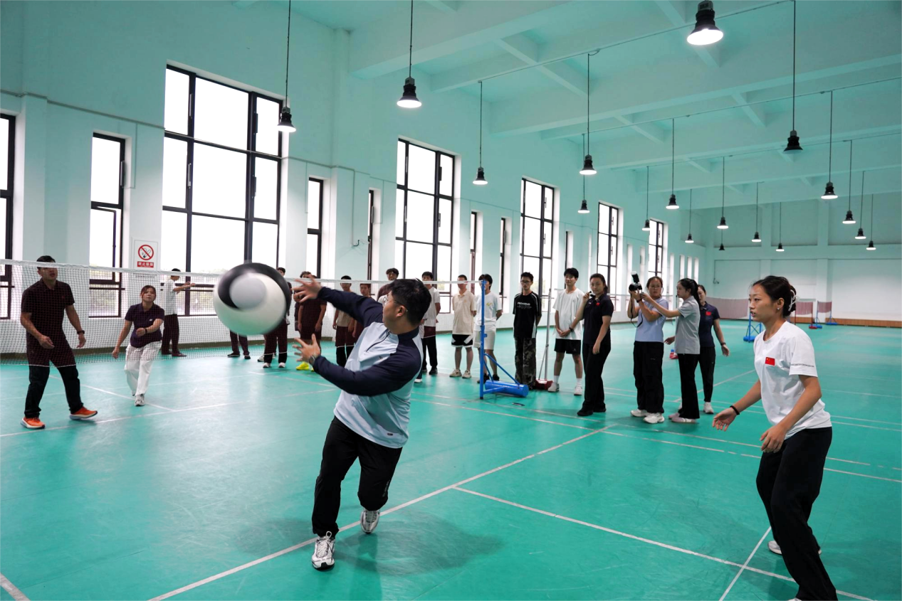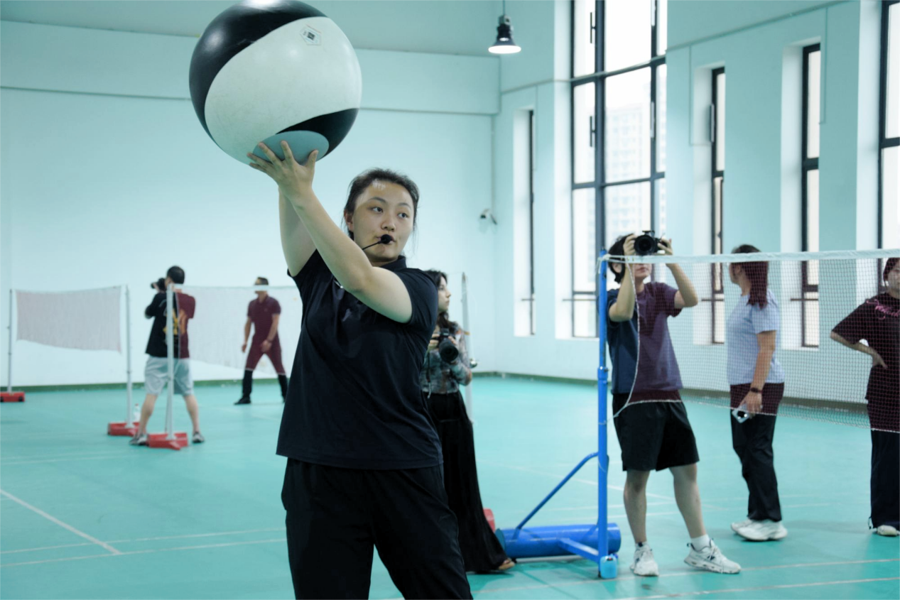 下午的实践教学研讨环节精彩纷呈。华东师范大学周燕教授的啦啦操与健美操教学中,两校学生先后展演并共学基础动作,现场气氛热烈。华东师范大学杨建营教授的柔力太极球展示,通过慢动作示范与球体控制要点讲解,让学生直观感受刚柔并济的运动魅力。上海中医药大学陆松廷教授的武术教学,从正踢腿到前扫腿逐项纠正动作,辅以武术文化讲解,引导学生领悟传统体育精神。华东理工大学刘文珂副教授的乒乓球教学则通过互动示范,展现了体育教学的创新成果。